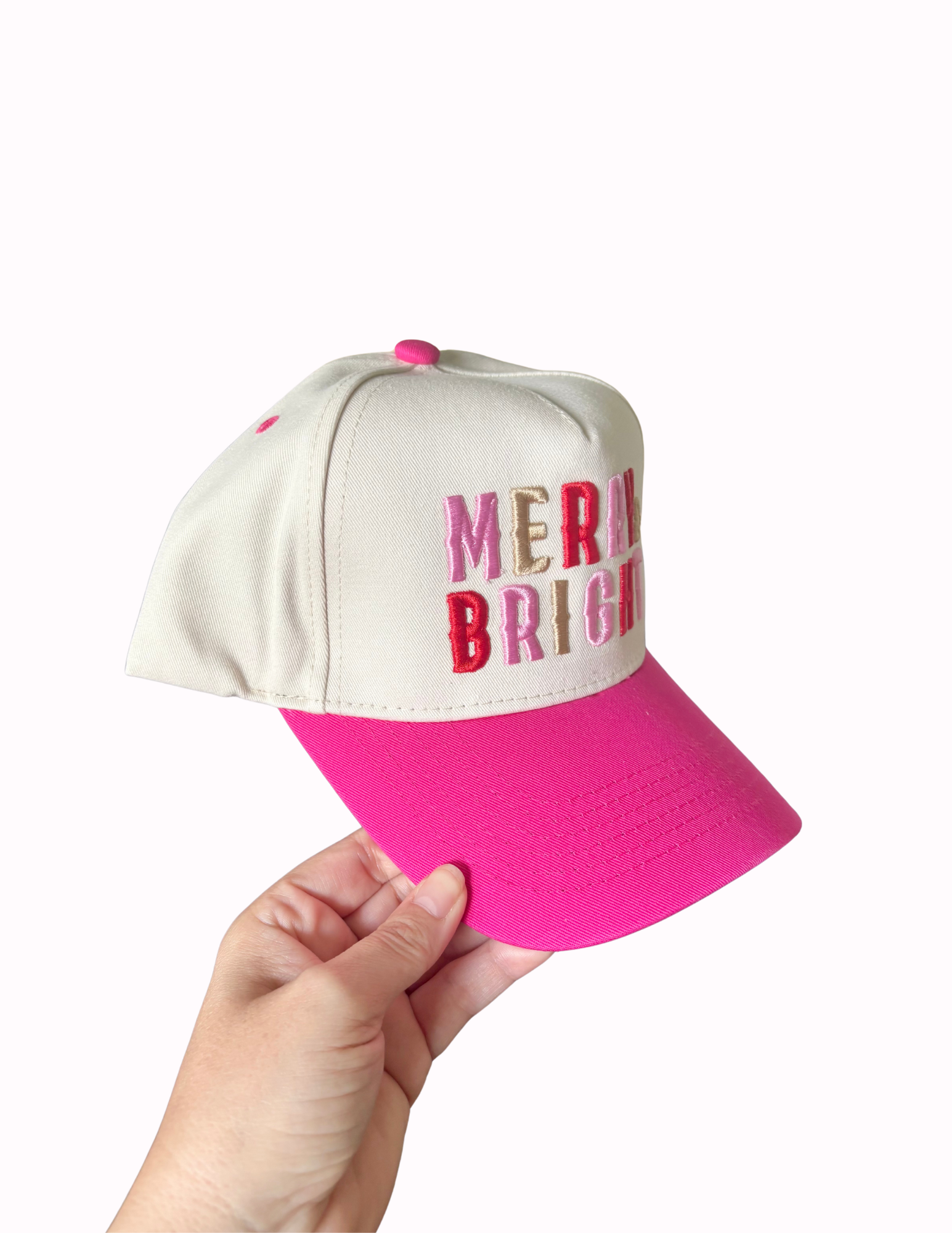 Spread holiday cheer with this cheerful pink canvas hat featuring "Merry & Bright" embroidery. Perfect for festive gatherings, seasonal photos, or adding a pop of joy to your everyday look.