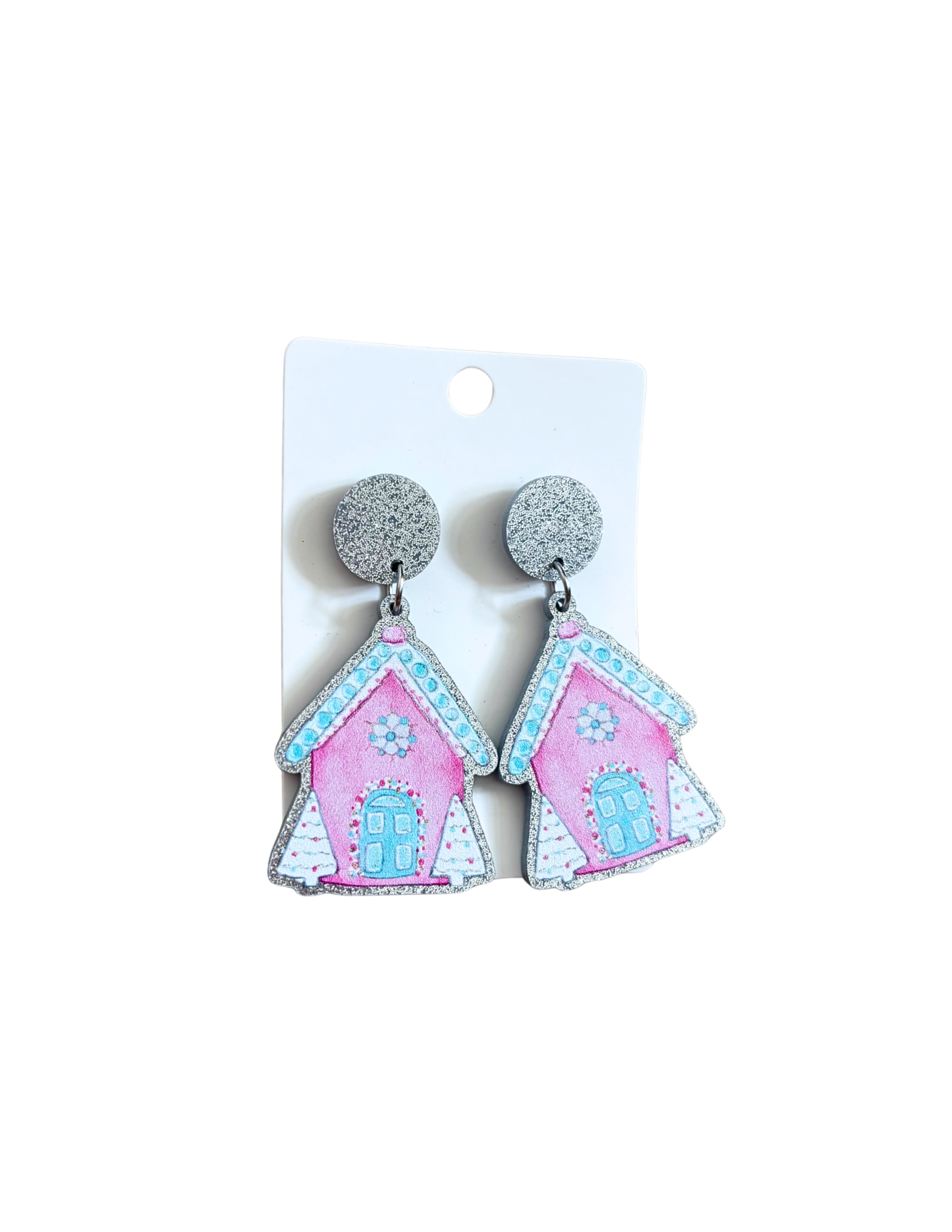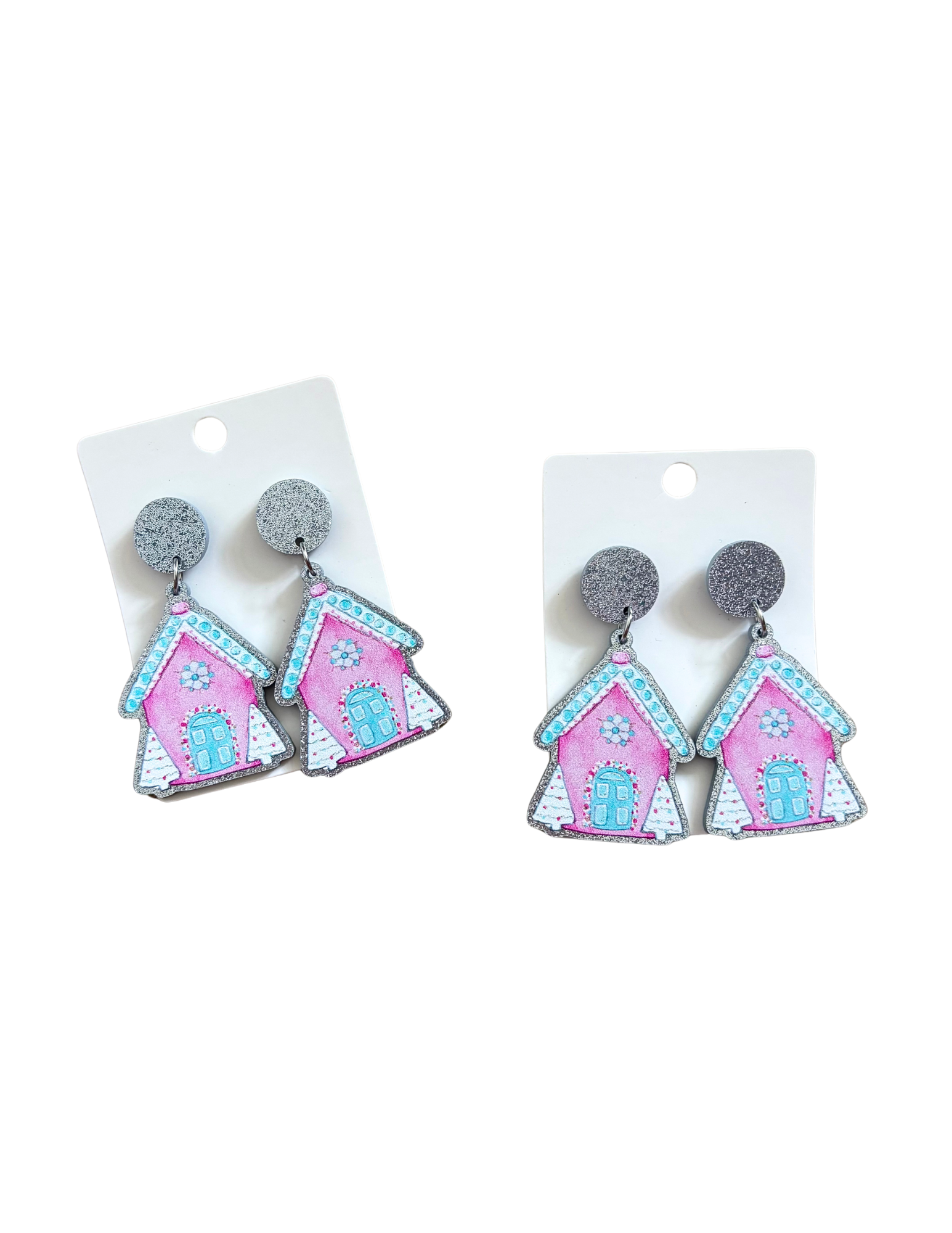 Bring sweet holiday fun to your look with these playful pink & mint Glitter Gingerbread House earrings! Sparkling with festive colors and glittery charm, they add a whimsical touch to any outfit.